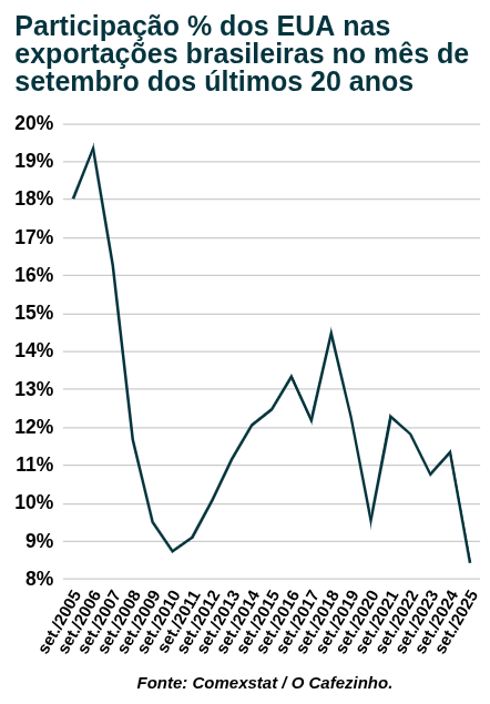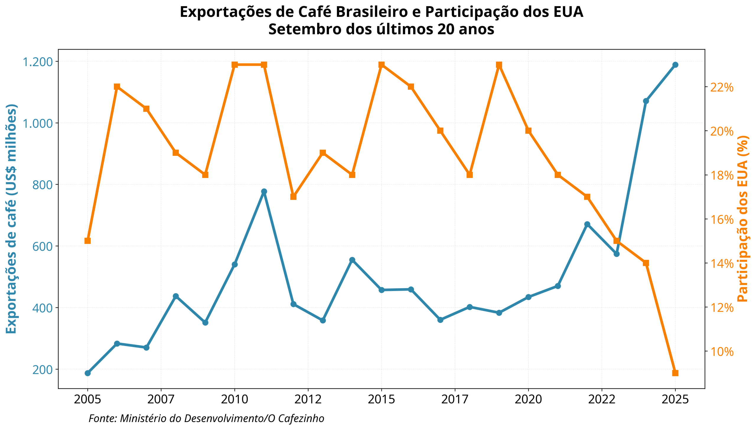O setor do café ilustra perfeitamente essa dinâmica. Em setembro, a exportação total de café brasileiro atingiu US$ 1,18 bilhão, um recorde histórico. No entanto, a participação dos EUA nessas exportações foi a menor de todos os tempos: apenas 9%. As compras americanas caíram quase 30% em relação a setembro do ano passado, totalizando apenas US$ 105,7 milhões.