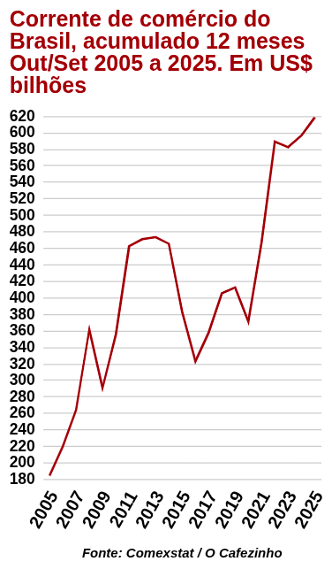 No acumulado dos últimos 12 meses (outubro de 2024 a setembro de 2025), o Brasil exportou US$ 339,8 bilhões — o equivalente a R$ 1,81 trilhão, mantendo um volume estável em relação ao ano anterior. A corrente de comércio, que é a soma de exportação e importação, atingiu US$ 618,7 bilhões (R$ 3,30 trilhões), um crescimento de 3,7% em relação aos 12 meses anteriores, consolidando o Brasil como uma potência comercial global.