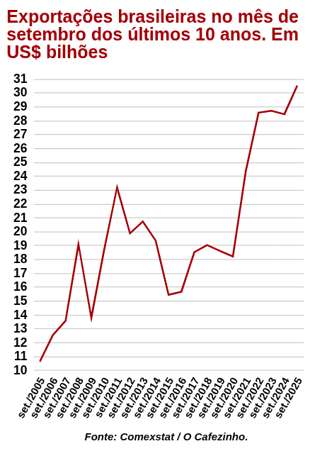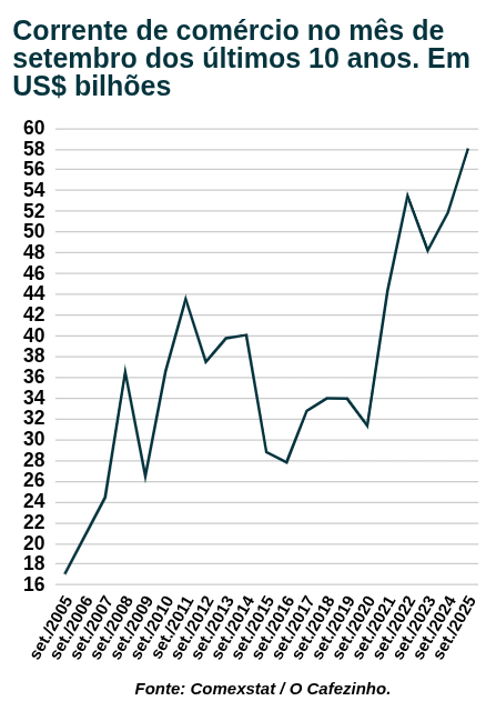 Os números de setembro também são impressionantes. O Brasil exportou US$ 30,5 bilhões, um crescimento de 7,2% em relação a setembro de 2024, e a maior marca já registrada para o mês. A corrente de comércio bateu recorde histórico, chegando a US$ 58,1 bilhões, um aumento de 12,0% sobre setembro de 2024. O saldo comercial ficou em US$ 3,0 bilhões, uma queda de 41,1% em relação a setembro de 2024, mas ainda um resultado sólido e alinhado com a média dos últimos 20 anos para setembro.