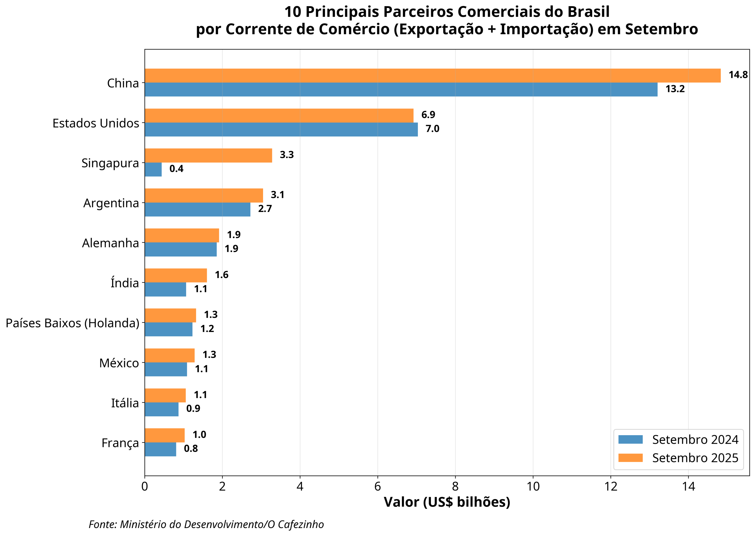 Os Estados Unidos aparecem em segundo lugar, com uma corrente de comércio de US$ 6,9 bilhões, uma queda em relação aos US$ 7,0 bilhões de setembro de 2024. Essa redução reflete o fato de que, apesar de o Brasil ter exportado bem menos para os Estados Unidos em setembro de 2025 em relação a setembro de 2024, as importações americanas aumentaram, resultando em uma corrente de comércio relativamente estável.