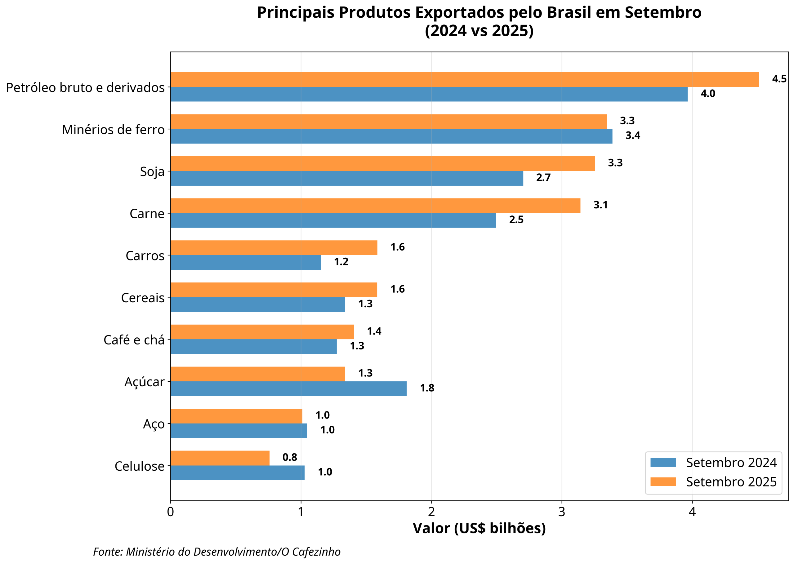 Entre os principais produtos exportados pelo Brasil em setembro, o petróleo bruto e derivados liderou com US$ 4,5 bilhões, seguido por minérios de ferro (US$ 3,3 bilhões) e soja (US$ 3,3 bilhões). As exportações de carne também tiveram destaque, atingindo US$ 3,1 bilhões, um crescimento de 26% em relação a setembro de 2024. Outros produtos importantes incluem carros, cereais, café e chá, açúcar, aço e celulose, demonstrando a diversificação da pauta exportadora brasileira.