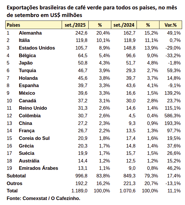 Enquanto isso, outros mercados compensaram e cresceram exponencialmente. A Alemanha se tornou a principal compradora de café verde do Brasil, com 20,4% do total — um aumento de 49% nas compras. A Itália vem em segundo lugar, com 10%. Os Estados Unidos caíram para o terceiro lugar. As exportações brasileiras de café para a China cresceram quase 200% em setembro…