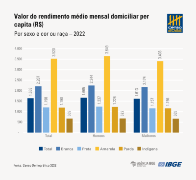 - O rendimento domiciliar per capita das populações amarela (R$ 3.520) e branca (R$ 2.207) supera o das populações preta (R$ 1.198), parda (R$ 1.190) e indígena (R$ 669).