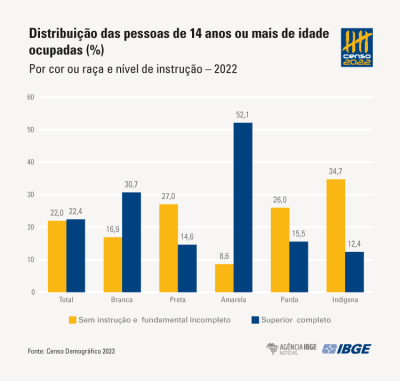 Considerando-se a cor ou raça, as pessoas ocupadas classificadas como indígenas (34,7%), pretas (27,0%) e pardas (26,0%) apresentaram os maiores percentuais de ocupados sem ensino fundamental completo. No outro extremo, mais da metade dos ocupados de cor ou raça amarela (52,1%), e quase um terço da população ocupada branca (30,7%), tinham o ensino superior completo.