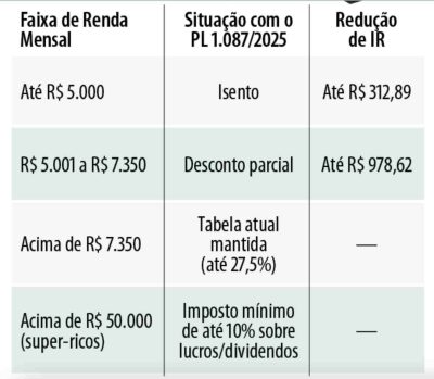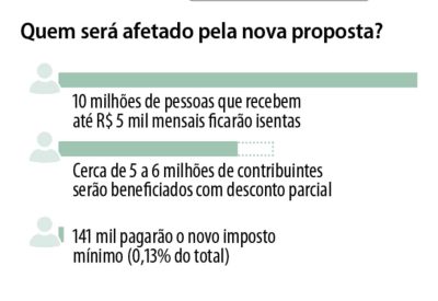 O imposto mínimo será suficiente para permitir a isenção total — para renda de até R$ 5 mil — e parcial — para renda entre R$ 5 mil e R$ 7.350, em que a redução é maior quanto menor a renda. Assim, o projeto não afeta as contas públicas, segundo Haddad.