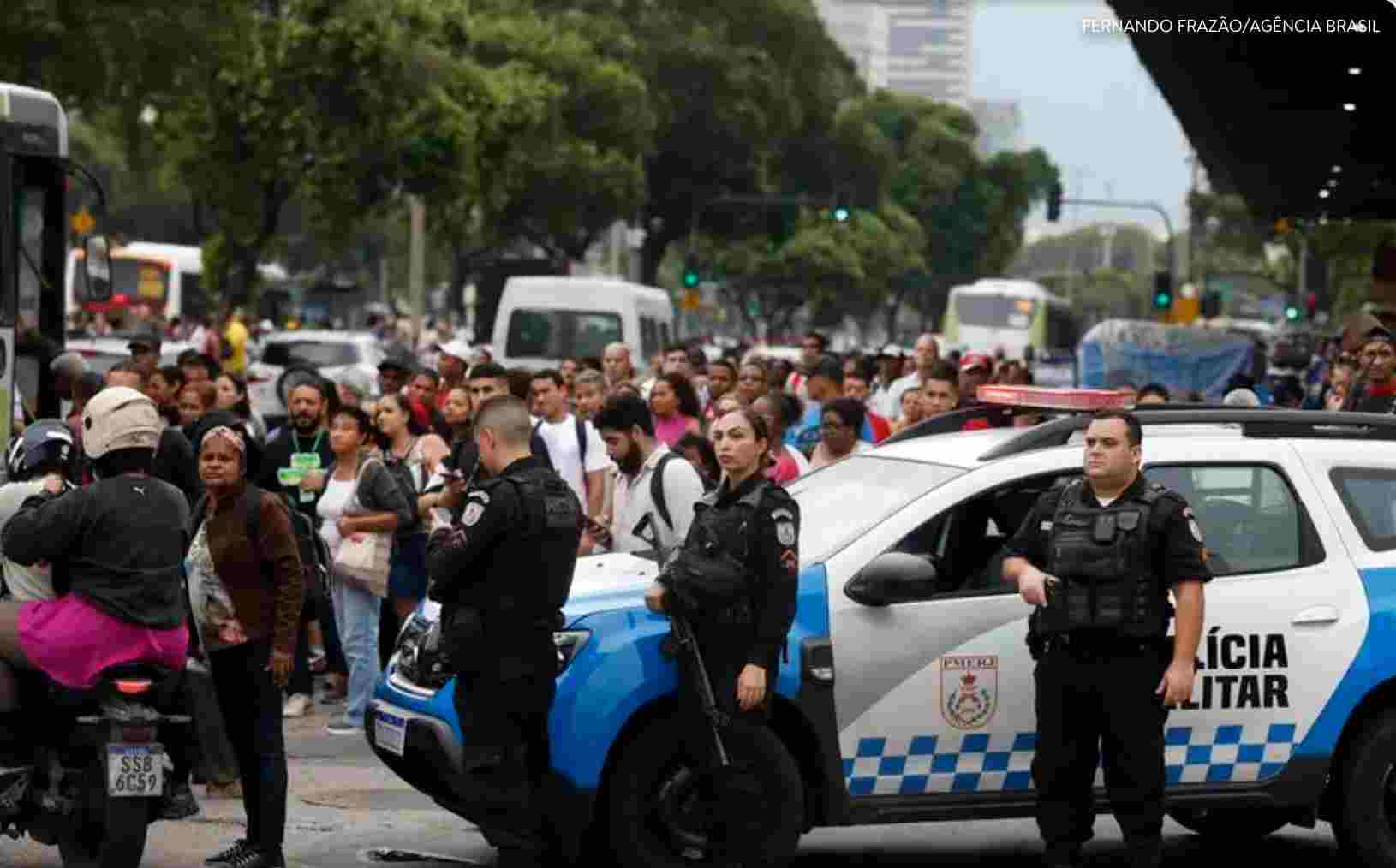 Durante operação, na terça-feira (28), agentes da Polícia Militar fazem guarda perto de filas nos pontos de ônibus na região da Central do Brasil