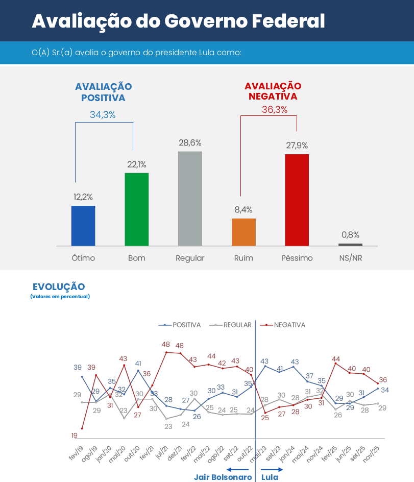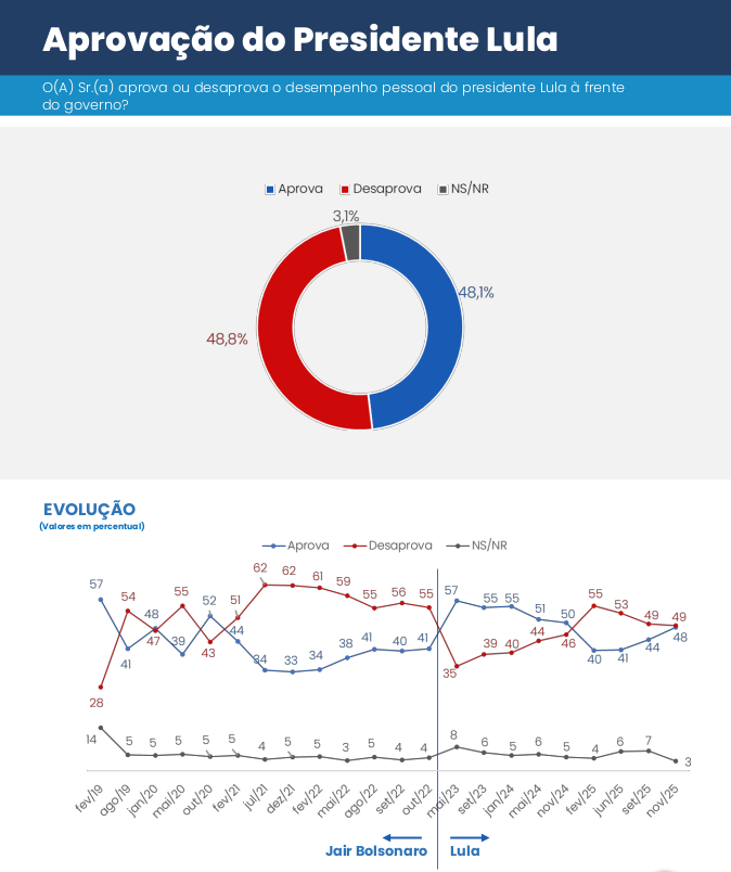 A aprovação pessoal do presidente Lula também mostra uma trajetória de alta, passando de 40% em fevereiro para 48% em novembro.