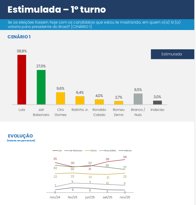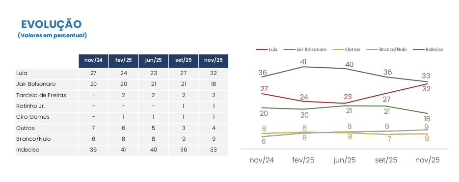 O crescimento de Lula na pesquisa espontânea é robusto. O presidente mostra uma força que não se via em outros levantamentos, enquanto o único outro nome com pontuação relevante, Jair Bolsonaro, está em declínio e inelegível.
