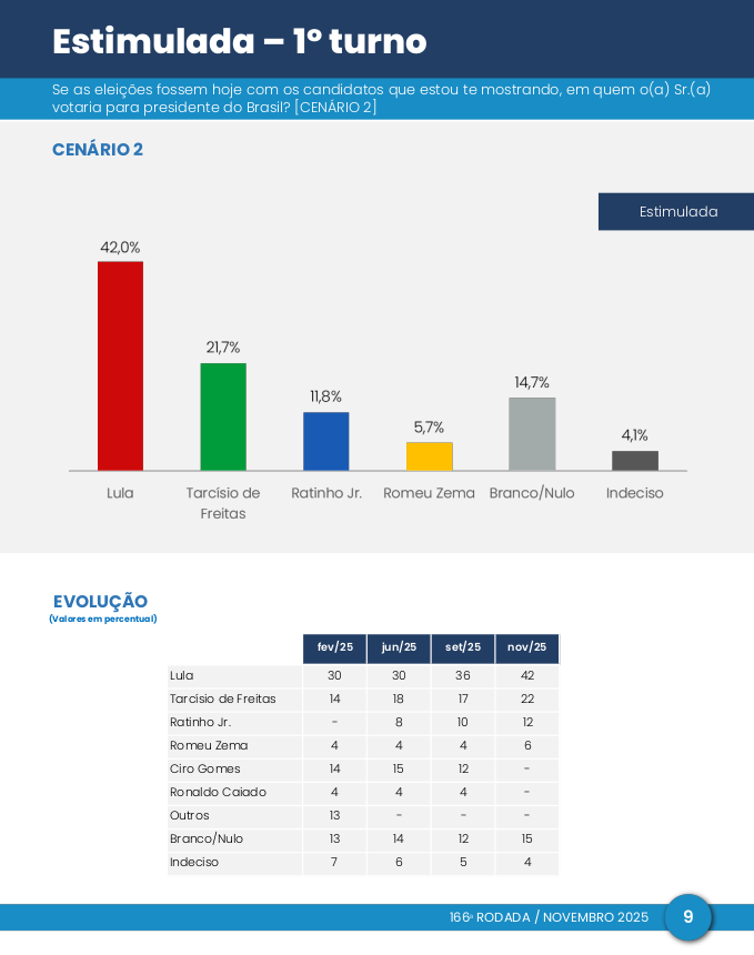 No segundo cenário, contra Tarcísio de Freitas, Lula também se fortaleceu, chegando a 42% e abrindo uma vantagem de 20 pontos.