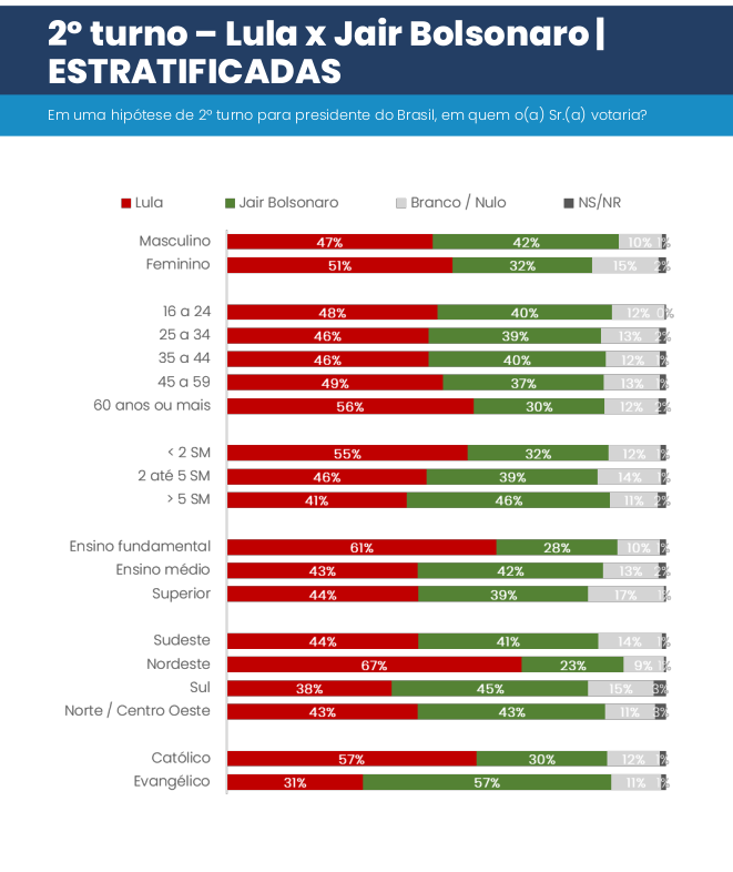 Num segundo turno hipotético, Lula venceria Bolsonaro na maioria dos estratos. Bolsonaro só ganharia entre eleitores de renda mais alta, no Sul e entre evangélicos.