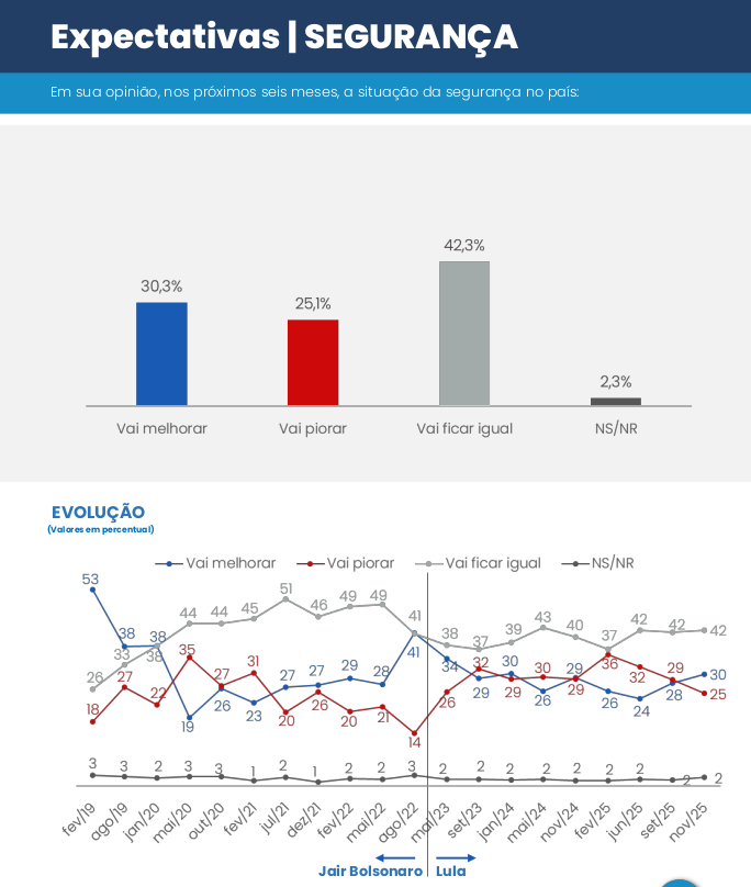 A percepção sobre a segurança pública, um ponto tradicionalmente explorado pela oposição, mostra melhora. A expectativa de que a segurança vai melhorar (30%) superou a de que vai piorar (25%).
