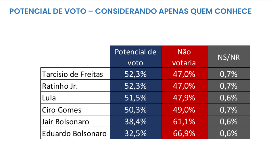 Isso se torna um problema considerável, dado que a rejeição ao ex-presidente é altíssima, chegando a 61% entre os que o conhecem. Esse fator limita o potencial de transferência de votos e impõe um teto a qualquer aliado.