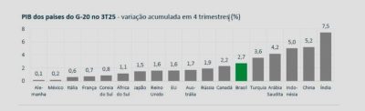 Dentre os países do G-20 que já divulgaram o resultado do PIB do terceiro trimestre, o Brasil ocupou a 11ª posição na margem; a oitava posição na comparação interanual e a sexta posição no acumulado em quatro trimestres, informa a SPE.