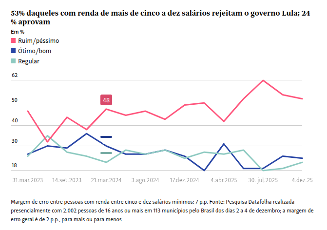 Na faixa de 2 a 5 salários mínimos, que representa aproximadamente um terço do eleitorado, e que é particularmente estratégica do ponto-de-vista político por apresentar abstenção mais baixa que a faixa de renda inferior, a aprovação saltou de 17% em fevereiro para 29% em dezembro. A desaprovação nessa faixa recuou de 47% em setembro para 39% em dezembro.