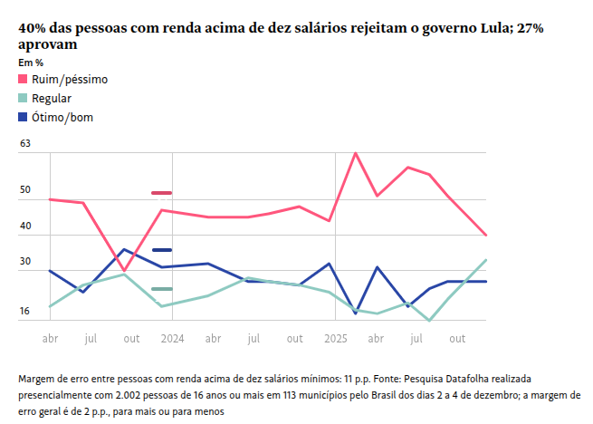 Na faixa acima de 10 salários mínimos, a desaprovação também recuou fortemente de 63% para 40%. O “regular” passou de 16% em julho para 33% em dezembro. A aprovação ficou em 27%.