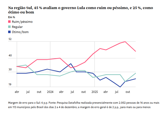 No Sul, a região onde o antipetismo mais se incrustrou, houve uma importante queda na rejeição ao governo Lula, com as notas ruim/péssimo caindo de 52% do eleitorado para 45% em dezembro. A nota ótimo/bom registrou melhora de 6 pontos desde julho, passando de 19% para 25%.