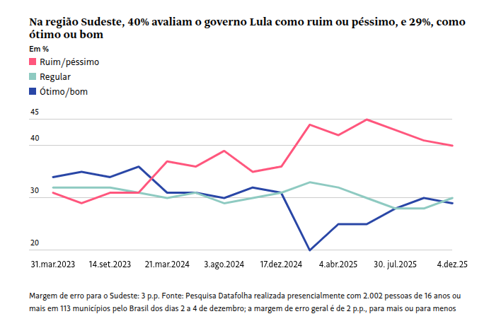 No Sudeste, que representa 46% do eleitorado e é a região mais populosa do país, a desaprovação (ruim/péssimo) recuou de 45% em junho para 40% em dezembro. O ótimo/bom está em 29%. Qualquer melhora nessa região tem efeito muito grande na avaliação nacional.