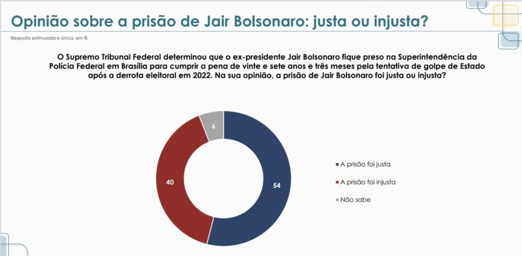 O Datafolha perguntou especificamente: “Na sua opinião, a prisão de Jair Bolsonaro foi justa ou injusta?” A resposta consolidada foi: