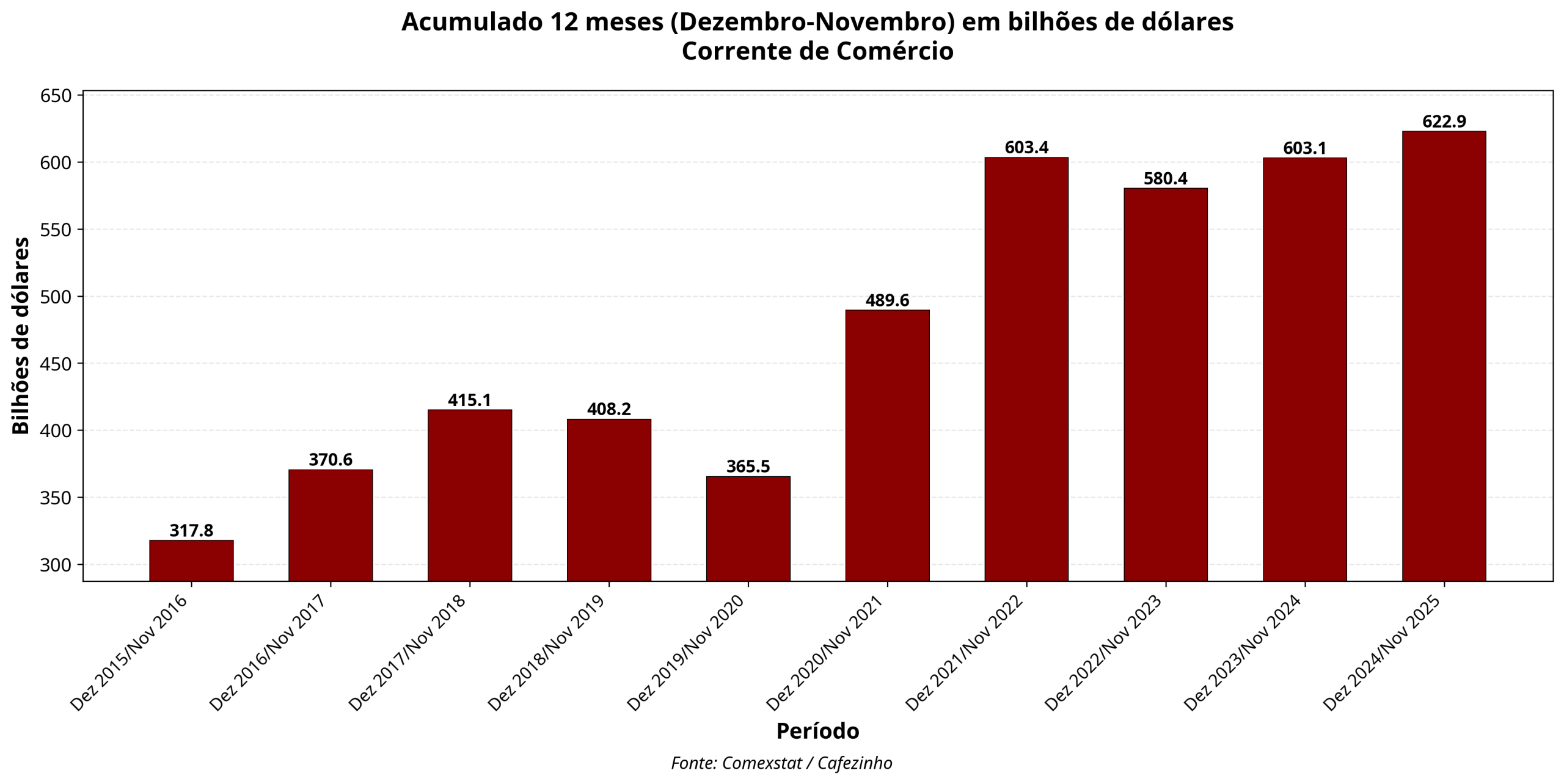 No acumulado de 12 meses até novembro de 2025, a corrente de comércio brasileira atingiu US$ 622,93 bilhões, um recorde histórico.