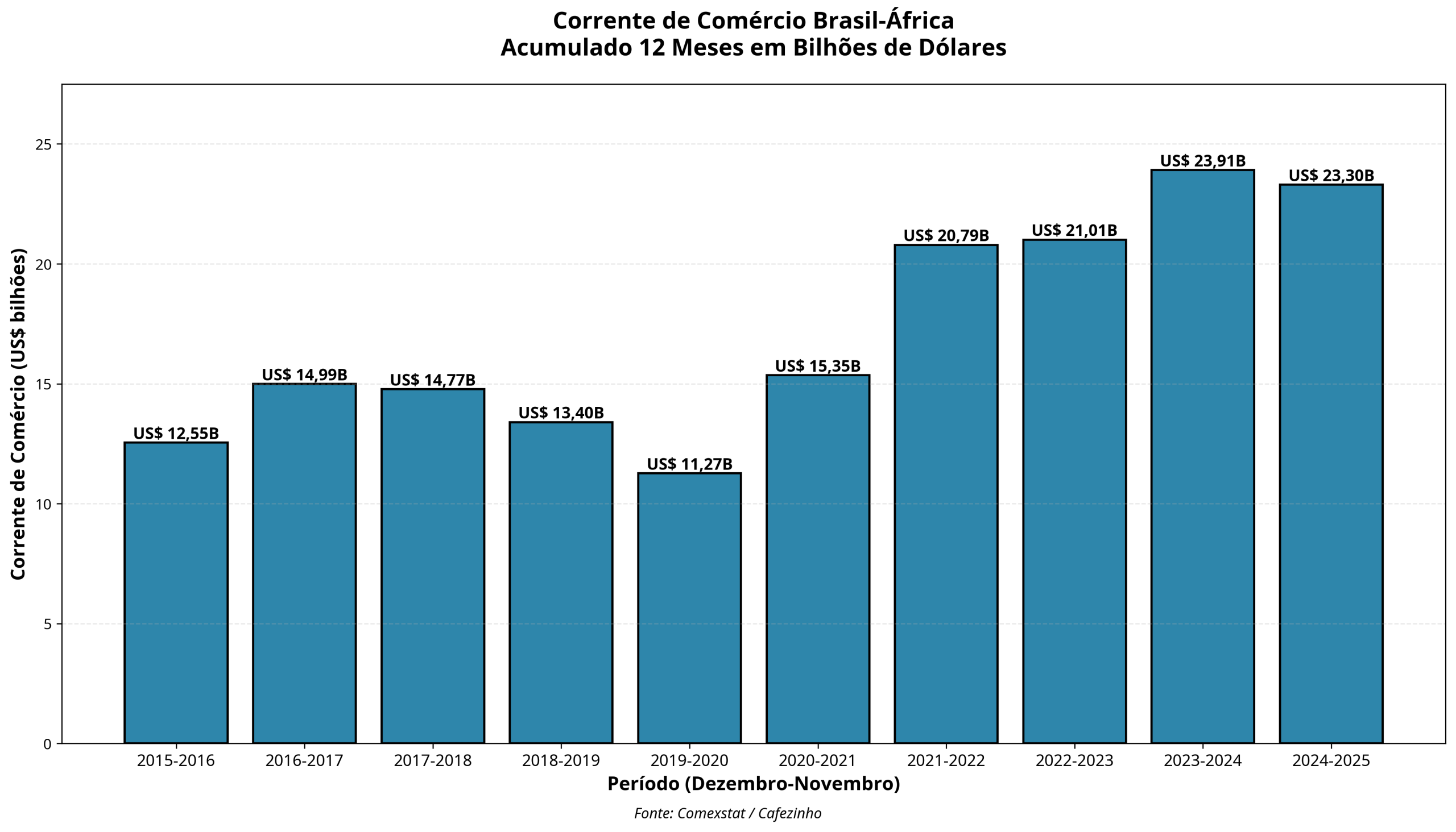 A corrente de comércio Brasil-África atingiu US$ 21,38 bilhões no acumulado de 12 meses até novembro de 2025, redução de 4,2% comparado ao mesmo período de 2024, quando registrou US$ 22,31 bilhões. Em 10 anos, a corrente de comércio cresceu 37,5%.