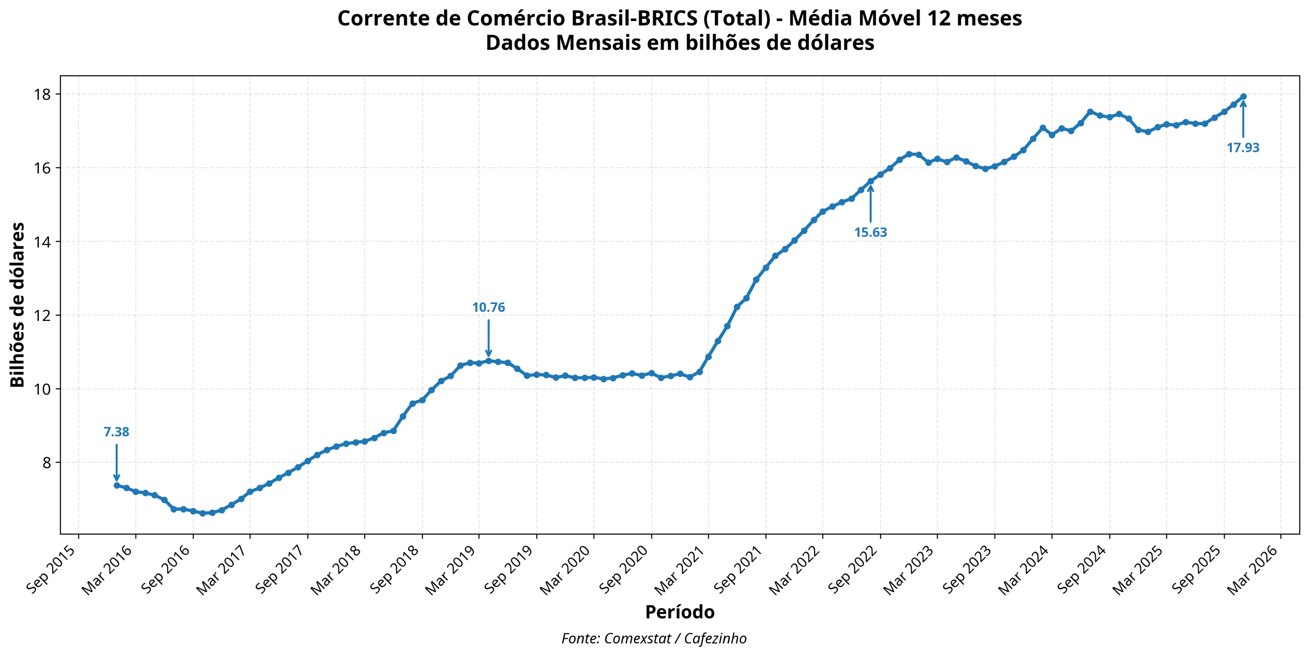A corrente de comércio Brasil-BRICS atingiu US$ 17,93 bilhões em novembro de 2025 (média móvel mensal de 12 meses), comparado a US$ 7,38 bilhões em janeiro de 2016, crescimento de 143,1% no período.