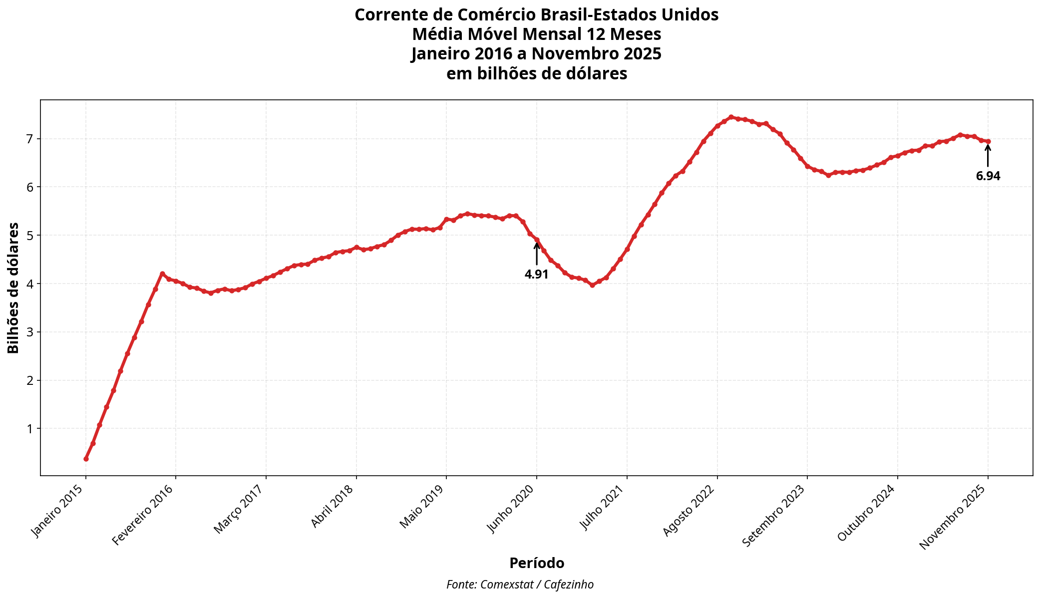 A corrente de comércio Brasil-EUA, ainda em média móvel mensal de 12 meses, atingiu US$ 6,94 bilhões em novembro de 2025, comparado a US$ 4,09 bilhões em janeiro de 2016, crescimento de 69,9% no período.