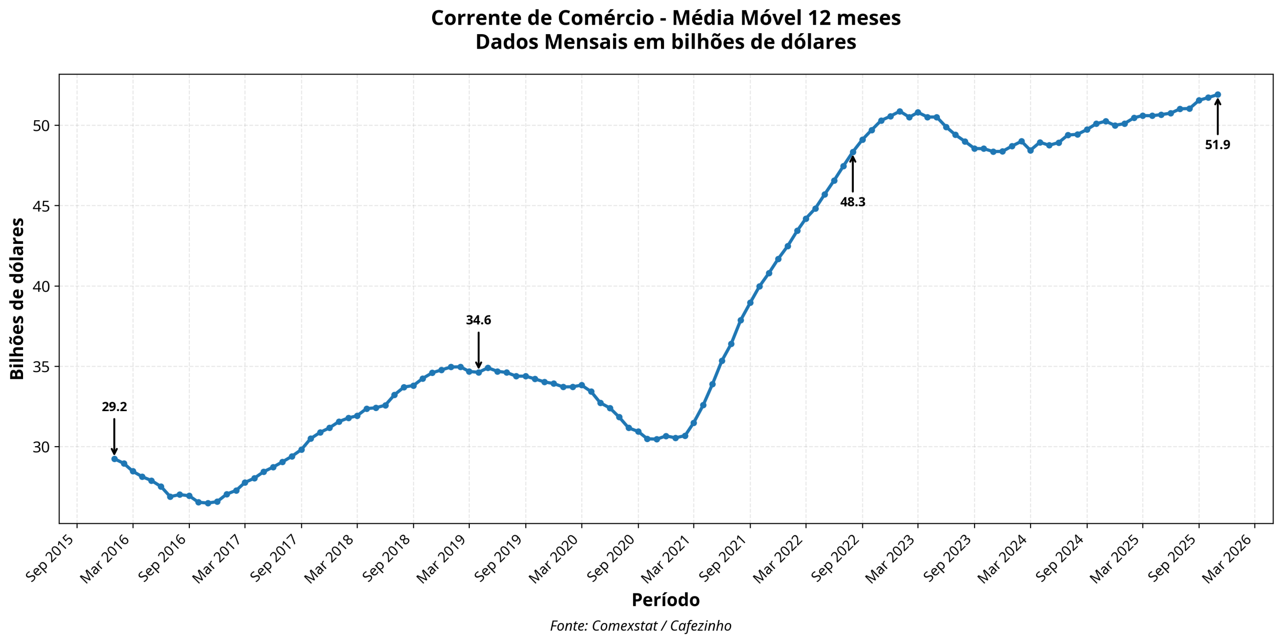 Em novembro de 2025, a corrente de comércio brasileira total, em média móvel mensal de 12 meses, atingiu US$ 51,91 bilhões, registrando variação de +0,37% em relação a outubro, quando foi de US$ 51,72 bilhões.