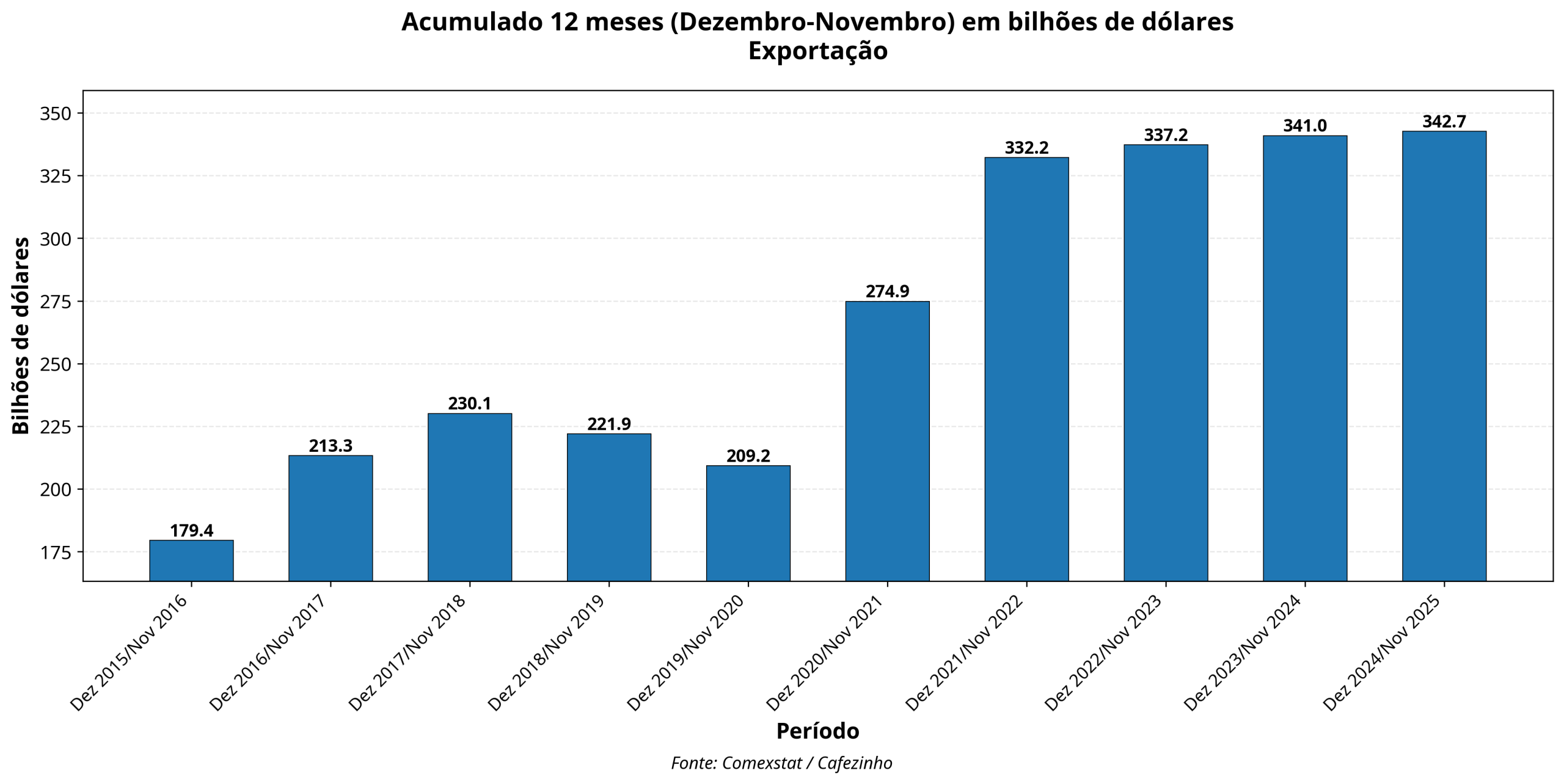 As exportações brasileiras, por sua vez, atingiram US$ 342,70 bilhões no acumulado de 12 meses até novembro de 2025. Comparado ao mesmo período de 2024, quando registraram US$ 340,95 bilhões, houve aumento de 0,5%. Também é um recorde histórico.