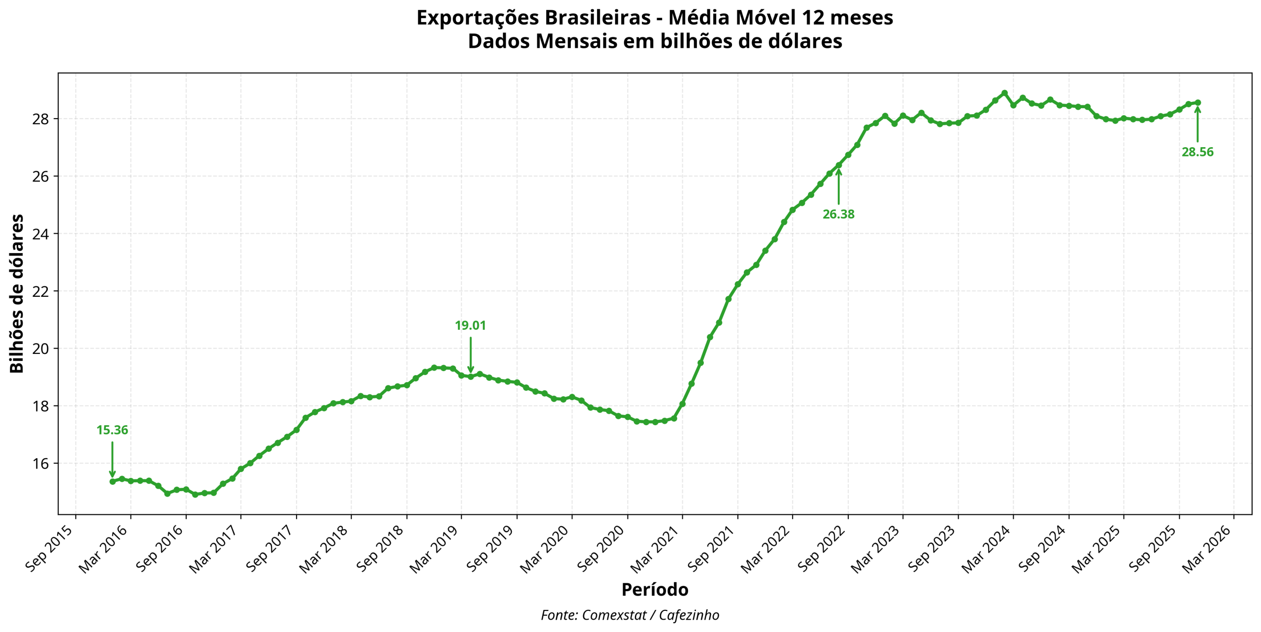 As exportações brasileiras em novembro, para todos os países, também em média móvel de 12 meses, atingiram US$ 28,56 bilhões, apresentando aumento de +0,21% frente a outubro de 2025.