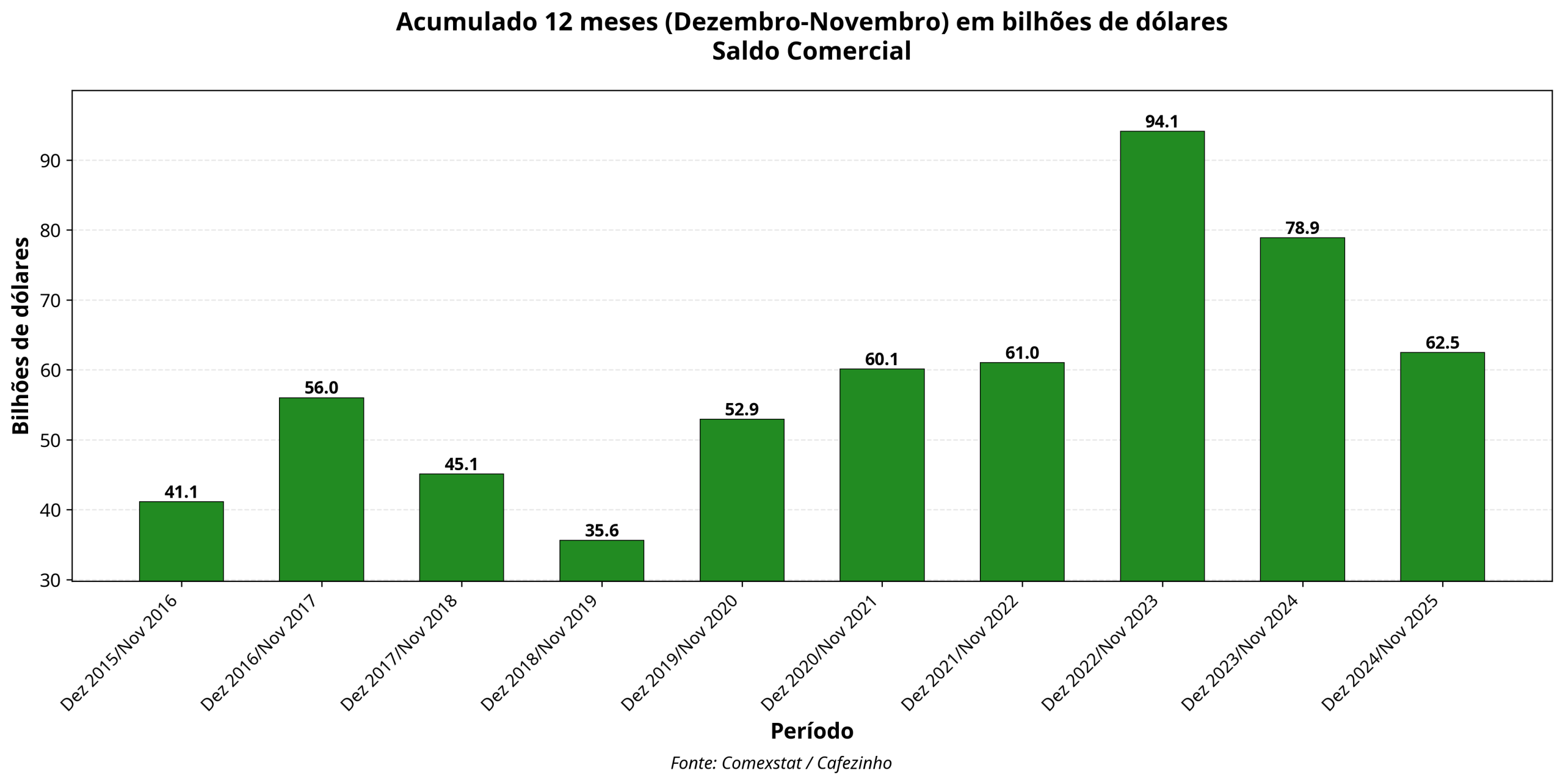 O superávit comercial brasileiro no acumulado de 12 meses até novembro de 2025 foi de US$ 62,47 bilhões. No mesmo período de 2024, o superávit foi de US$ 78,86 bilhões. Este é o terceiro maior superávit de toda a história do Brasil, superado apenas pelos que obtivemos em 2023 e 2024.