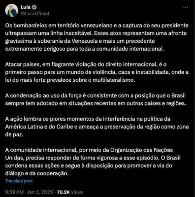 “Os bombardeios em território venezuelano e a captura do seu presidente ultrapassam uma linha inaceitável. Esses atos representam uma afronta gravíssima à soberania da Venezuela e mais um precedente extremamente perigoso para toda a comunidade internacional”, escreveu Lula