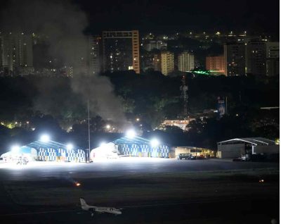 Fumaça sobe do aeroporto de La Carlota no sábado após o ataque da Força Delta dos EUA. | Matias Delacroix/AP