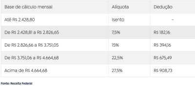 Tabela mensal do Imposto de Renda em 2026