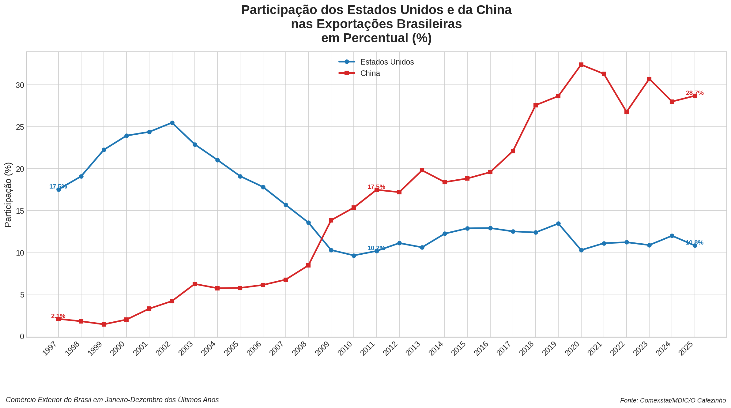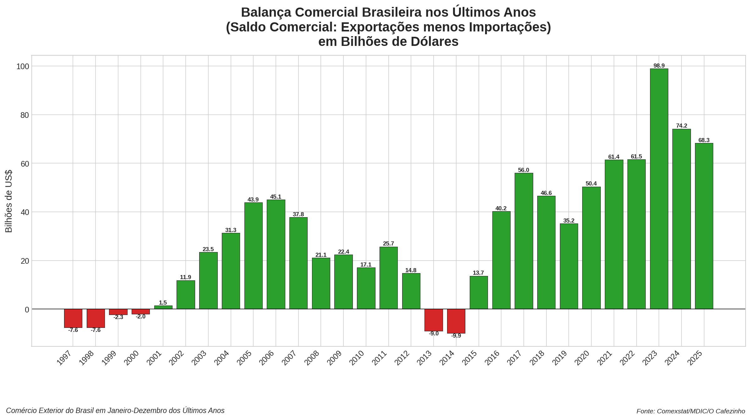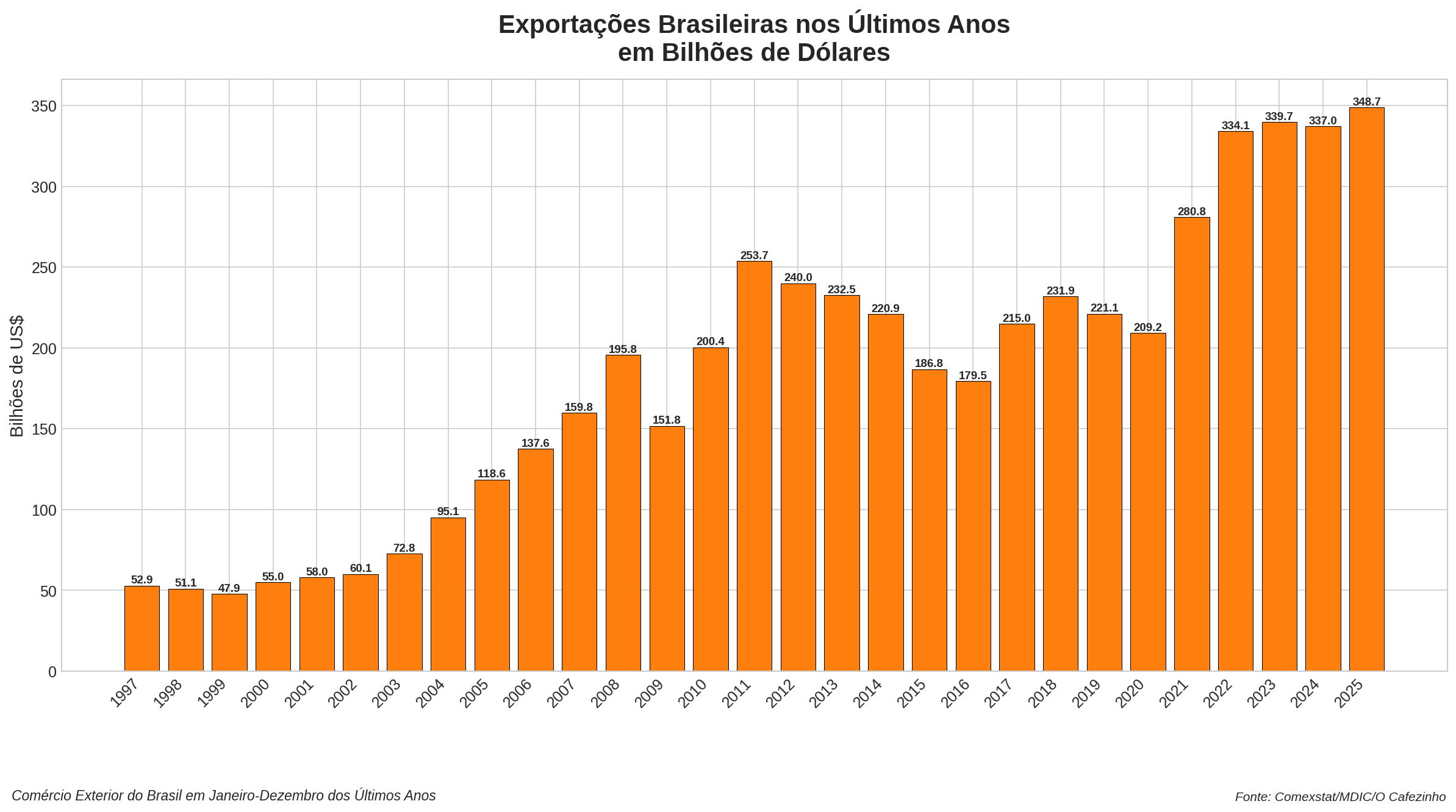 Este valor representa um aumento de 3,5% sobre 2024, mas é quando olhamos o quadro histórico, com um pouco mais de distância, que podemos avaliar o tamanho do crescimento do comércio e o aumento da participação do Brasil na economia global.