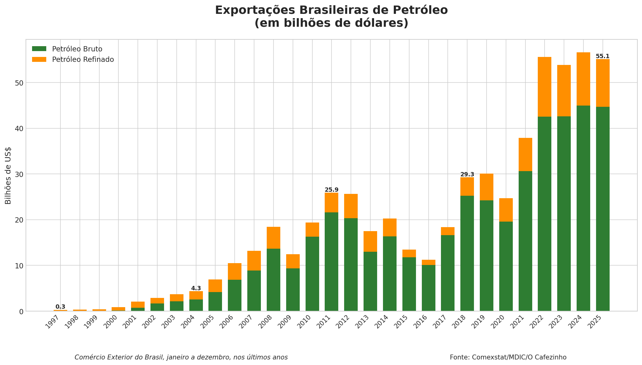 O Brasil exportou US$ 55,11 bilhões em petróleo em 2025, um crescimento de 691,7% em 20 anos. Em 2005, as exportações de petróleo somavam apenas US$ 6,96 bilhões. Do lado das importações, o Brasil comprou US$ 22,16 bilhões em petróleo em 2025, resultando em um saldo positivo de US$ 32,95 bilhões.