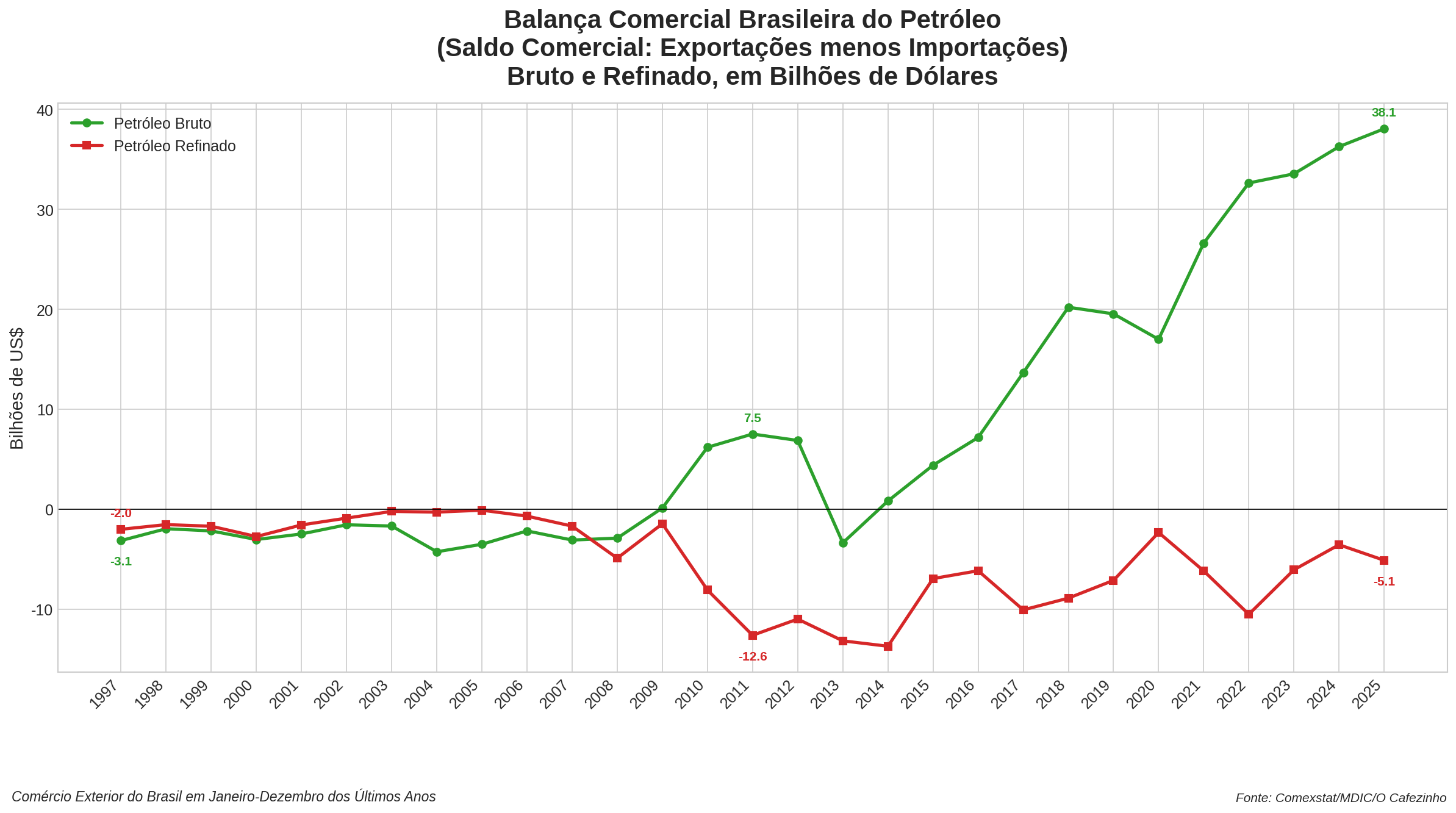 O petróleo bruto respondeu por US$ 44,67 bilhões em exportações, com saldo positivo de US$ 38,06 bilhões, em 2025. Já o petróleo refinado exportou US$ 10,44 bilhões, mas o Brasil ainda importa US$ 15,55 bilhões em derivados, gerando um déficit de US$ 5,11 bilhões nesse segmento.