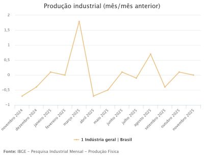 Entre as grandes categorias econômicas, ainda na comparação com outubro de 2025, na série com ajuste sazonal, bens de consumo duráveis, ao recuar 2,5%, assinalou a taxa negativa mais elevada em novembro de 2025 e eliminou parte da expansão de 2,8% verificada no mês anterior. O setor produtor de bens intermediários (-0,6%) também mostrou resultado negativo e marcou o terceiro mês consecutivo de queda na produção, período em que acumulou perda de 1,8%. Por outro lado, os segmentos de bens de capital (0,7%) e de bens de consumo semi e não duráveis (0,6%) assinalaram as taxas positivas em novembro de 2025, com o primeiro avançando 2,1% em três meses seguidos de crescimento; e o segundo acumulando ganho de 1,5% no período outubro-novembro de 2025.
