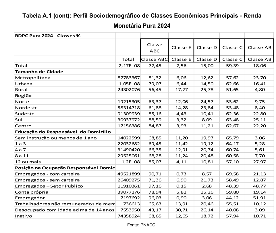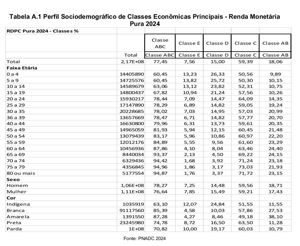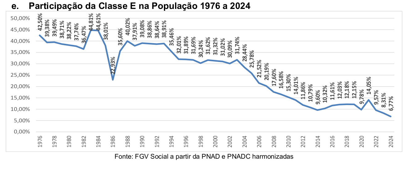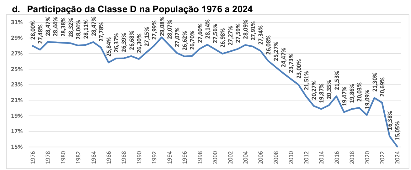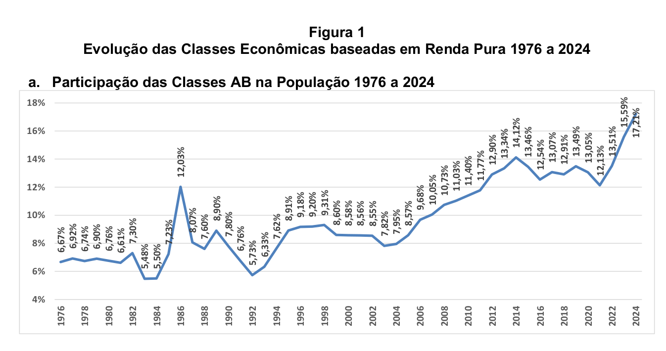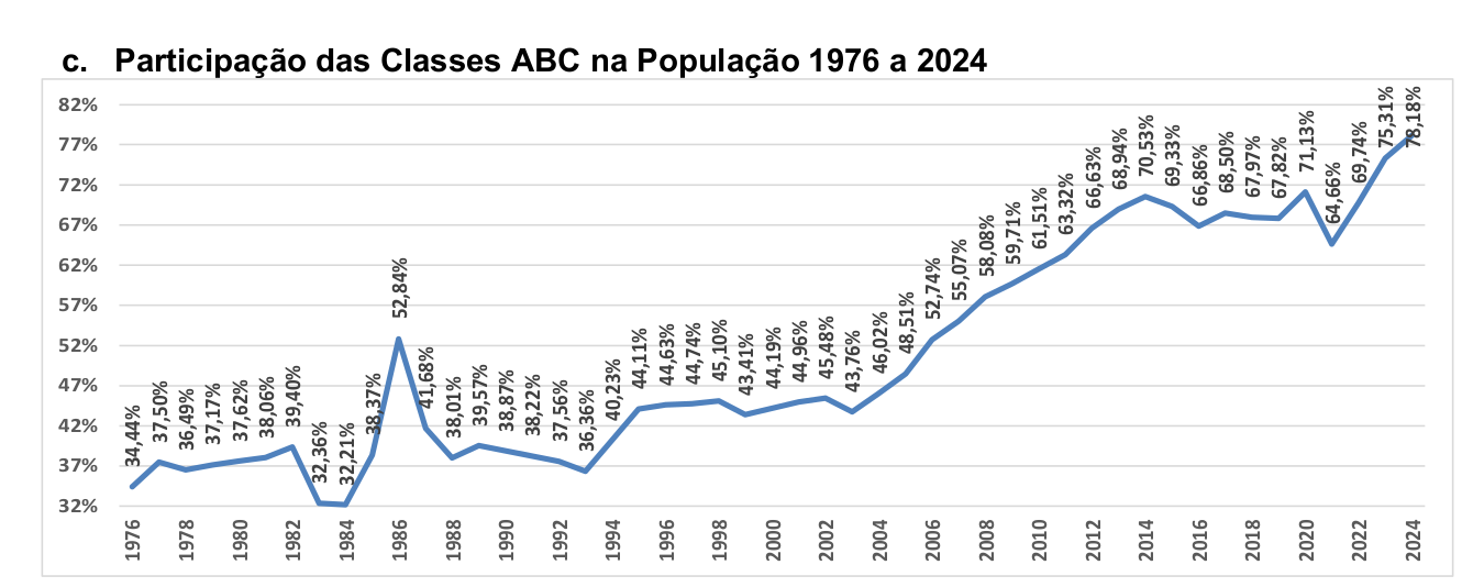 Já a classe AB, que representa a classe média tradicional e os estratos de maior renda, chegou a 17,21%, outro recorde histórico. Ao mesmo tempo, as classes mais pobres recuaram aos menores níveis da série: a classe D caiu para 15,05%, e a classe E para apenas 6,77% da população.