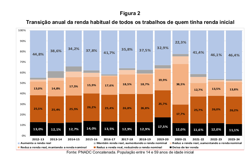 Além do crescimento estrutural das classes médias, o estudo revela uma melhora inédita na mobilidade econômica recente. Utilizando dados longitudinais da PNAD Contínua, que acompanham as mesmas pessoas ao longo do tempo, a FGV mostra que, em 2023-2024, 46,4% dos trabalhadores que já tinham renda registraram aumento real, o maior percentual de toda a série analisada.