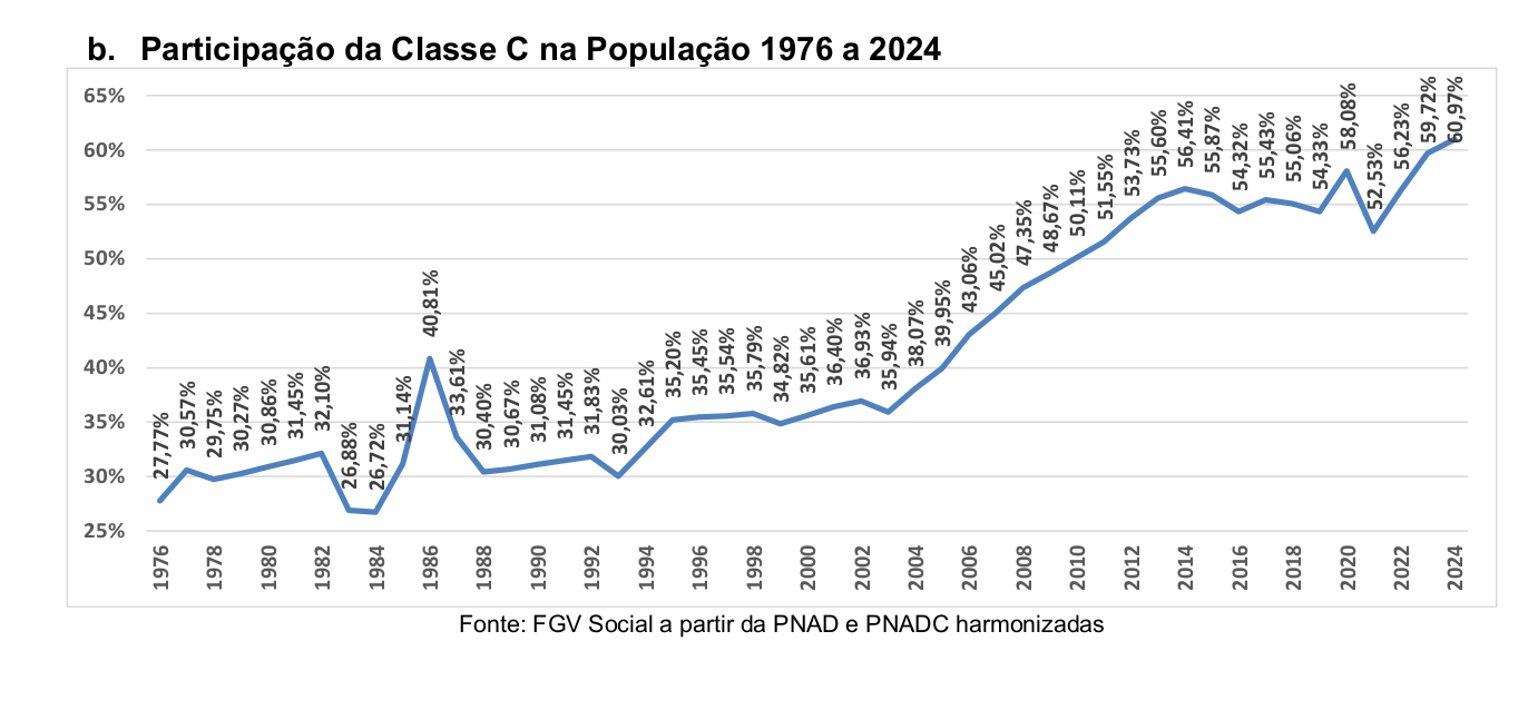 O levantamento foi elaborado pelo economista Marcelo Neri, da FGV Social, e analisa a evolução das classes econômicas brasileiras entre 1976 e 2024, com base em microdados harmonizados da PNAD e da PNAD Contínua do IBGE. A pesquisa amplia o foco tradicional das análises de pobreza, observando toda a distribuição de renda e identificando com mais precisão os movimentos de ascensão e mobilidade social.