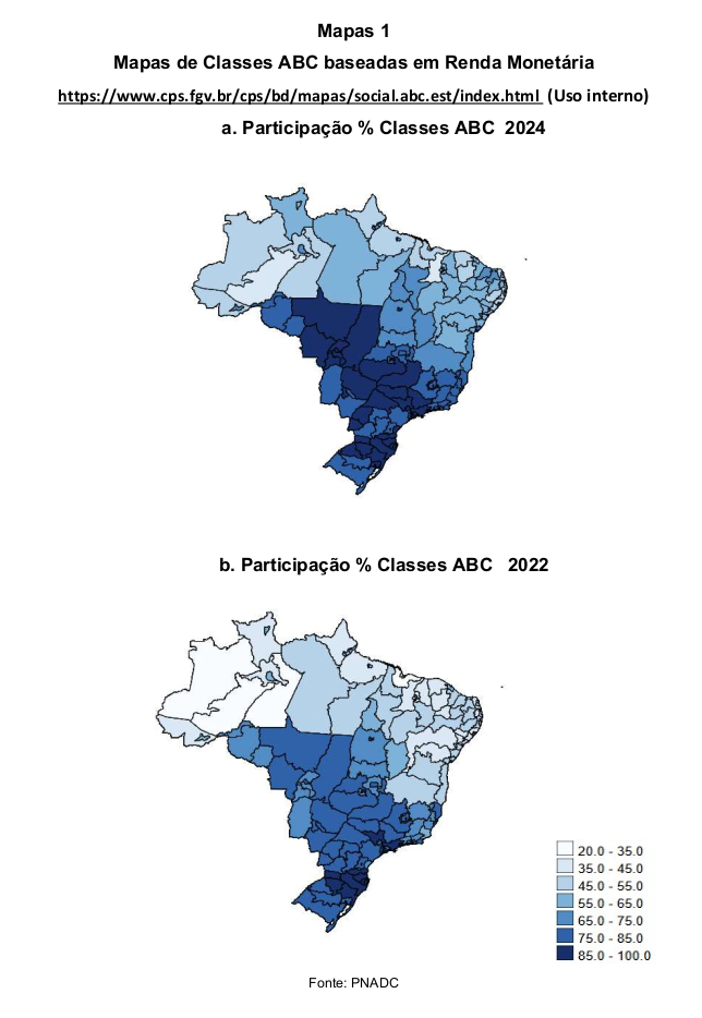 A análise territorial reforça o caráter disseminado da melhora. Mapas por estados e regiões mostram avanço da classe ABC em praticamente todo o país entre 2022 e 2024, com destaque para Sudeste, Sul e Centro-Oeste, mas também com ganhos relevantes no Nordeste e no Norte. Em várias unidades da federação, mais de 75% da população já se encontra nas classes ABC.