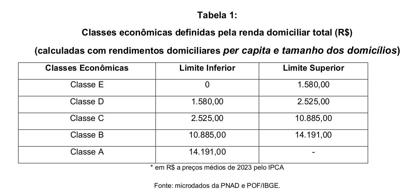 O estudo adota uma definição de classe baseada na renda domiciliar per capita, ajustada pelo tamanho médio dos domicílios e corrigida pelo IPCA. Com isso, evita distorções comuns quando se observa apenas a renda total das famílias, desconsiderando o fato de que os domicílios brasileiros ficaram significativamente menores ao longo das últimas décadas.