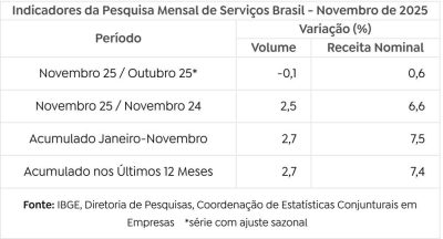 A PMS permite o acompanhamento conjuntural do setor de serviços no país, investigando a receita bruta de serviços nas empresas formalmente constituídas, com 20 ou mais pessoas ocupadas, que tenham serviços não financeiros como sua principal atividade, excluídas as áreas de saúde e educação. Há resultados para o Brasil e todas as unidades da federação. Os dados podem ser consultados no Sidra. A próxima divulgação da PMS, relativa ao mês de dezembro de 2025, será em 12 de fevereiro de 2026.