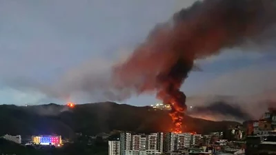 Incêndio na base militar de Fuerte Tiuna em Caracas, Venezuela, em meio ao ataque dos EUA em 3 de janeiro de 2026 | AFP