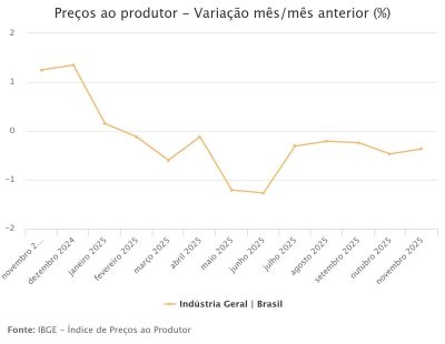 Os preços da indústria nacional caíram 0,37% em novembro frente a outubro (-0,47%), influenciados principalmente pelas indústrias extrativas, que registraram variação de -3,43%. Essa foi a décima taxa negativa consecutiva após uma série de 12 resultados positivos seguidos, entre fevereiro de 2024 e janeiro de 2025. Nos últimos 12 meses, o índice apresentou queda de 3,38% e o acumulado no ano ficou em -4,66%. Em novembro de 2024, a variação mensal havia sido de 1,25%.