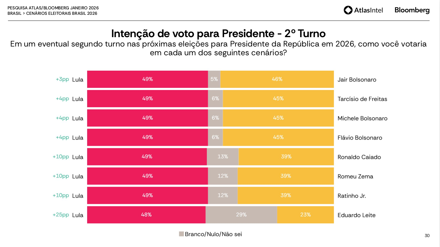 Nos cenários de segundo turno, o quadro permanece estável. Lula vence todos os principais adversários, com margens mais apertadas contra os nomes mais fortes da direita e vantagens mais amplas contra candidatos menos competitivos.
