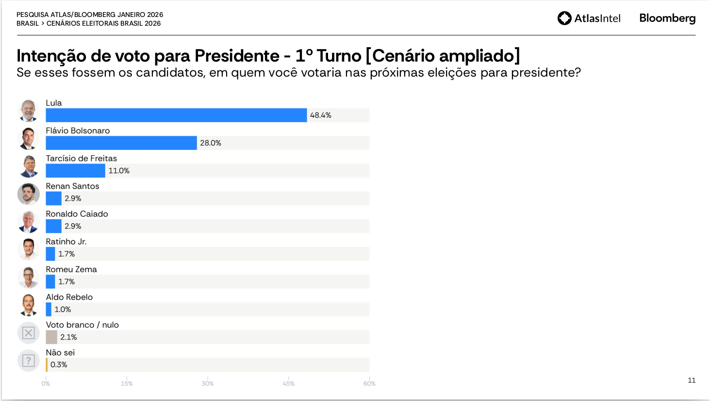 No cenário ampliado, que reúne todos os principais nomes, Lula aparece com 48,4%, muito próximo de uma vitória em primeiro turno. Flávio Bolsonaro surge com 28%. Tarcísio fica com apenas 11%. Os demais candidatos têm desempenhos residuais, como Ratinho Jr. com 1,7%.
