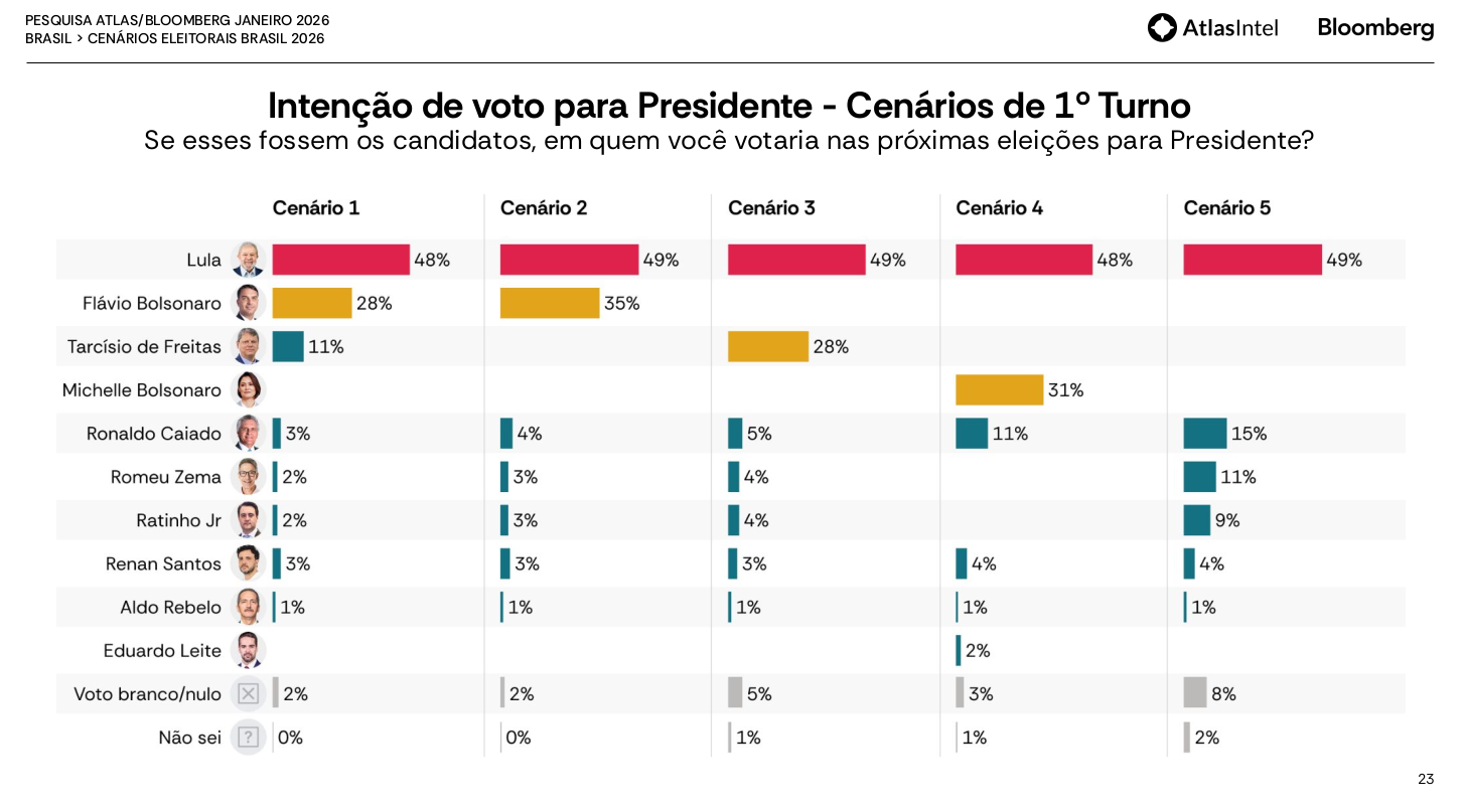 Em síntese, a nova Atlas Intel/Bloomberg é uma pesquisa positiva para Lula, revela um cenário estável para o campo democrático, consolida Flávio Bolsonaro como principal nome da direita e indica que Tarcísio de Freitas está ficando para trás. O tempo passa, o nome de Flávio se torna mais conhecido como candidato, e a discussão sobre a viabilidade de Tarcísio fica cada vez mais defensiva.
