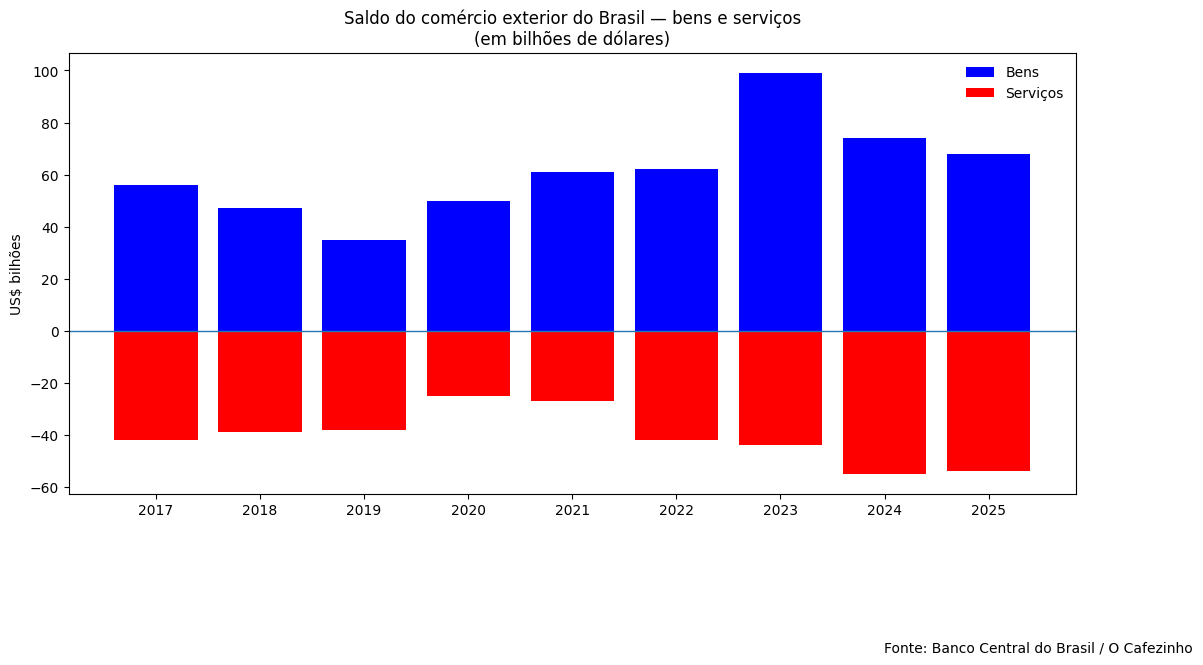 O Brasil vive uma situação de equilíbrio. O superávit de US$ 68 bilhões em bens, no ano passado, foi praticamente anulado pelo déficit de US$ 54 bilhões em serviços. O saldo combinado de bens e serviços ficou em apenas US$ 340 milhões positivos em 2025.