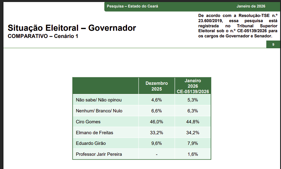 Na pesquisa espontânea da Paraná Pesquisas, Ciro aparece com 15%, contra 12,3% de Elmano. Mas quando se somam os 4% atribuídos a Camilo Santana, o campo governista chega a 16%, caracterizando empate técnico. Na estimulada, nota-se uma movimentação favorável a Elmano, ainda que sutil: entre dezembro e janeiro, Ciro recuou de 46% para 44,8%, enquanto Elmano avançou de 33,2% para 34,2%.